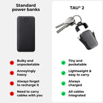 Introducing TAU 2 - your trusty, always-charged, universal keyring emergency power bank. Never again will you have to suffer the indignity of your phone giving up on you at the worst possible moment. You’ll no longer need to carry bulky power banks to make important calls 📞, pay with your phone 💳, or use GPS maps 🗺️, even towards the end of the day when your phone's battery is running low.